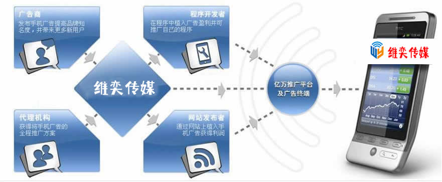 维奕传媒以无线互联网为营销推广媒介,面向WAP网站和客户端投放定向广告,为网站主提供广告营收、内容支持和发展用户等增值服务;为广告代理商提供高效的无线广告分销平台,促进广告传播速度和效果;同时为广告主提供最精准的无线营销平台,使广告主能够以低成本、低投入方式获得高回报的营销成果。